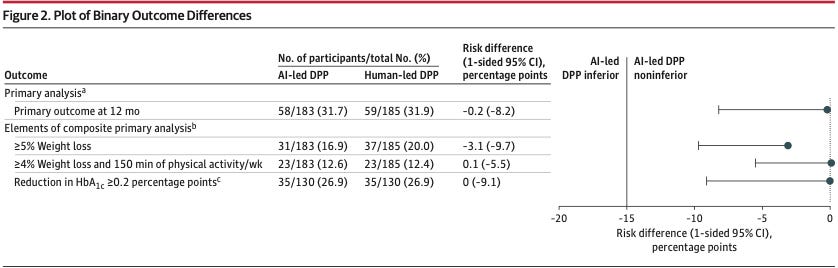 Non-inferiority confirmed: 31.7% in the AI-led group and 31.9% in the human-led group achieved the primary composite outcome, which included weight loss, physical activity, and HbA1c targets at 12 months. A risk difference of -0.2%, well within the pre-specified non-inferiority margin of -15%.