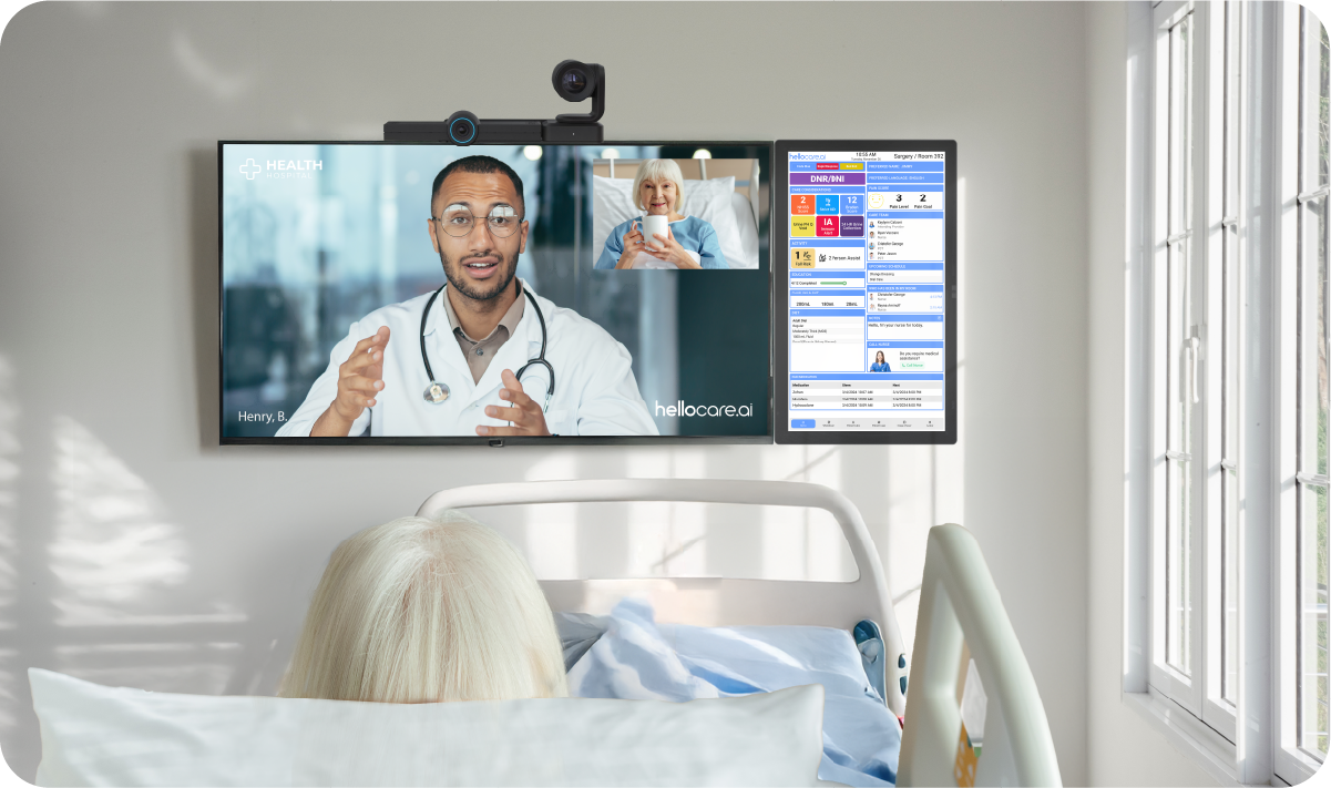 When a patient is admitted, bedside devices, video systems, and monitoring tools connect into a single virtual care platform that is integrated with the Epic EHR. The platform combines AI, secure video collaboration, real-time communication tools, and clinical workflow integration to support patient observation, fall prevention, remote consults, and communication between care teams, patients, and families.