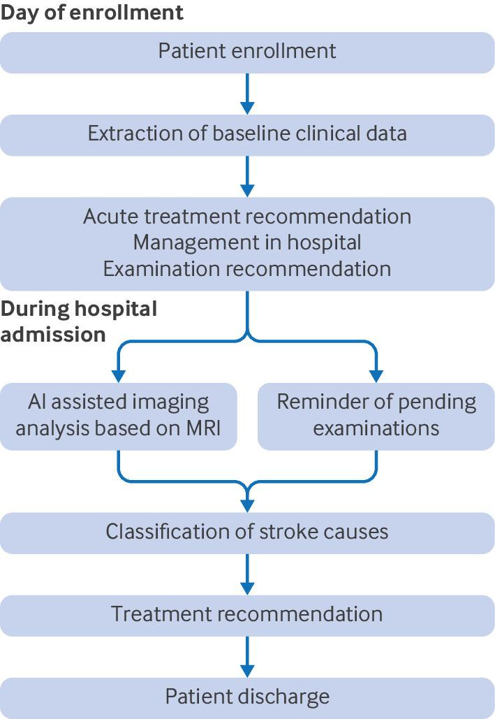 The system combined AI-assisted imaging analysis, classification of stroke cause, reminders for pending assessments, and evidence-based treatment recommendations during admission and at discharge.